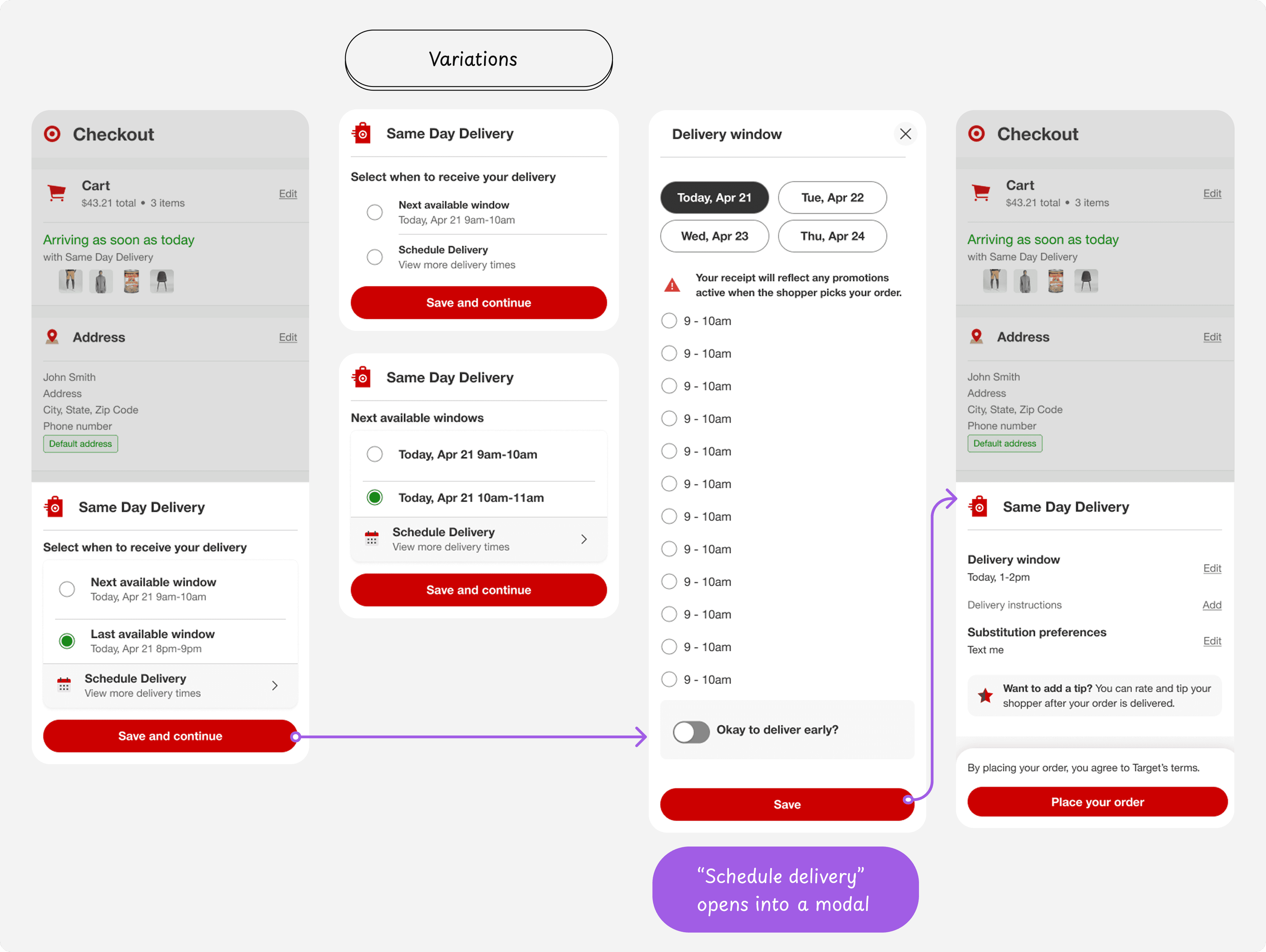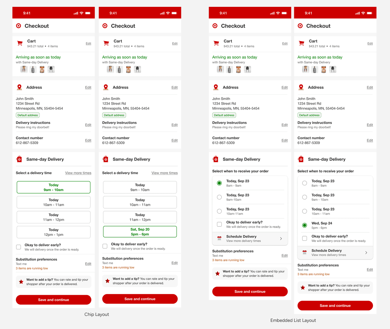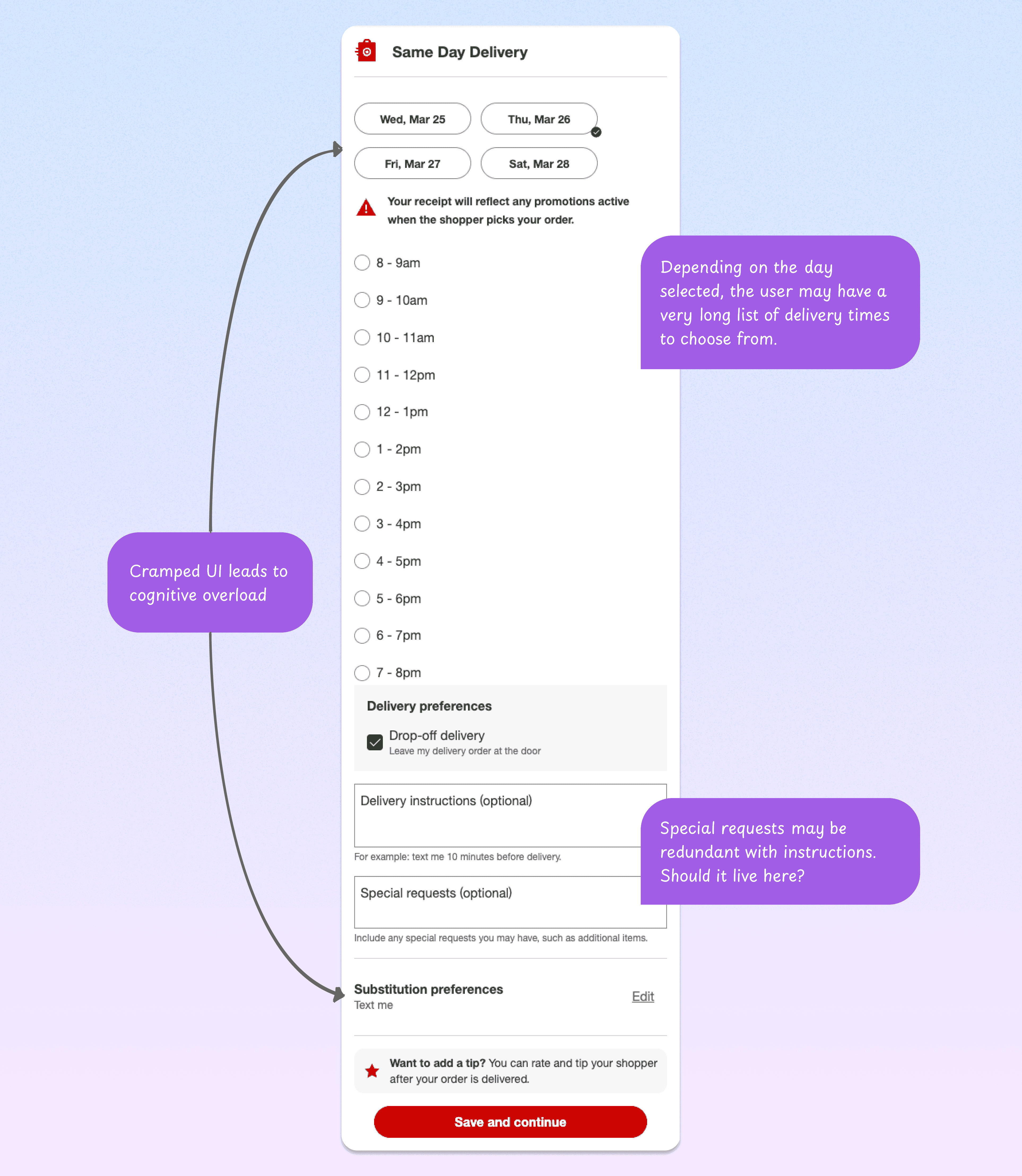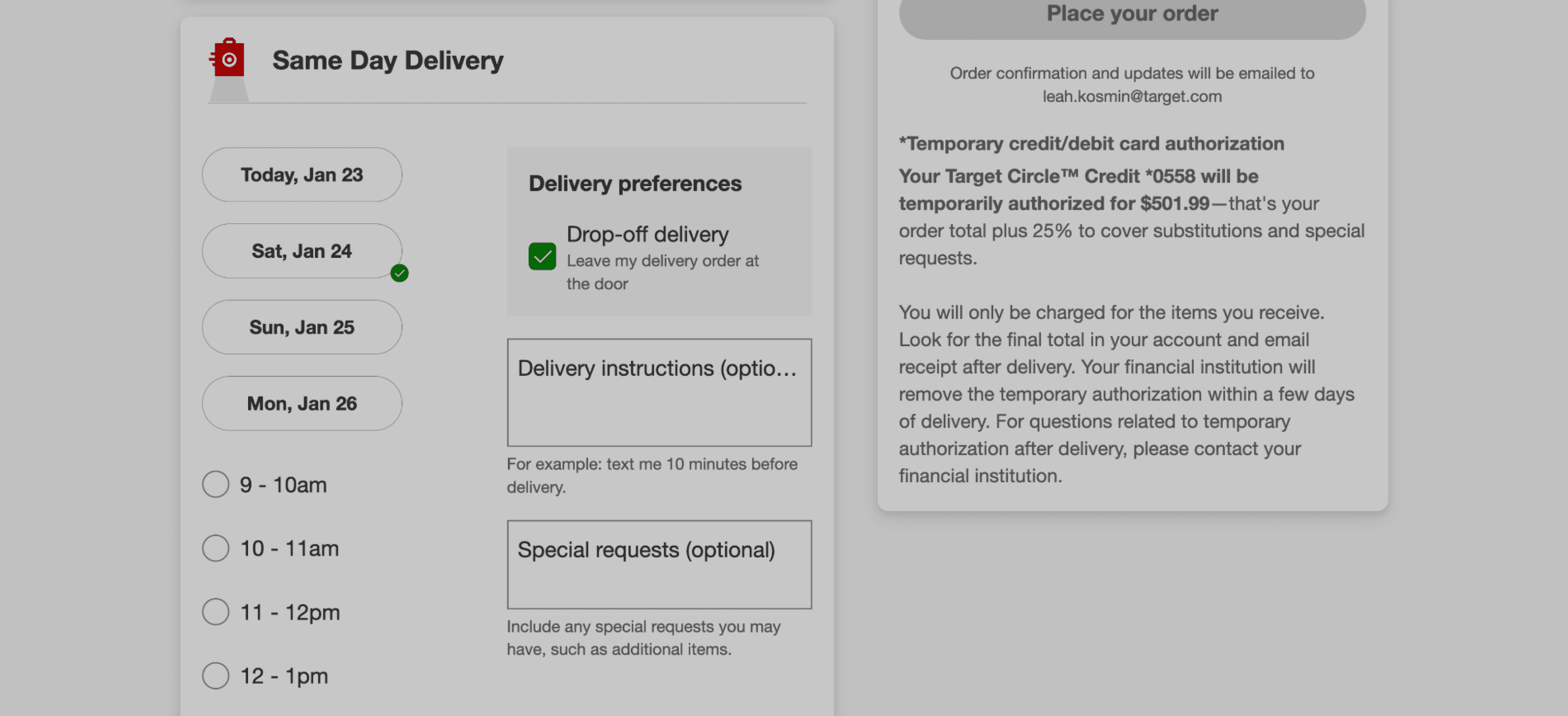 Today, shoppers have a multitude of shipping options to receive their order, including same-day delivery. Guests are required to select a delivery window time before completing the checkout process. The flow works, but the UI has not been evaluated or updated in many years.