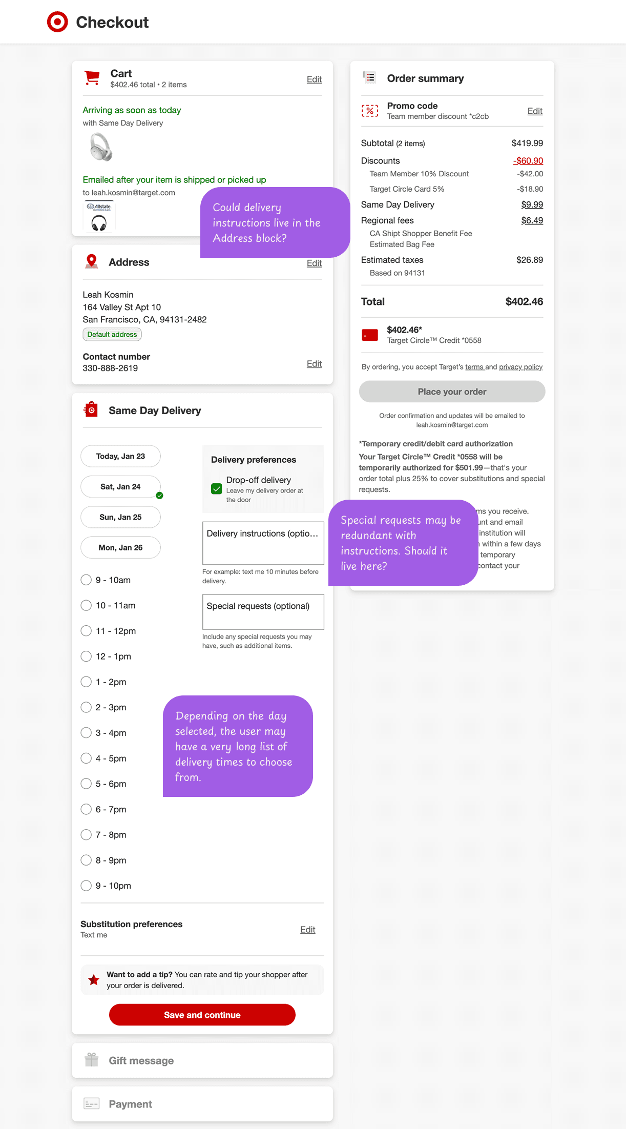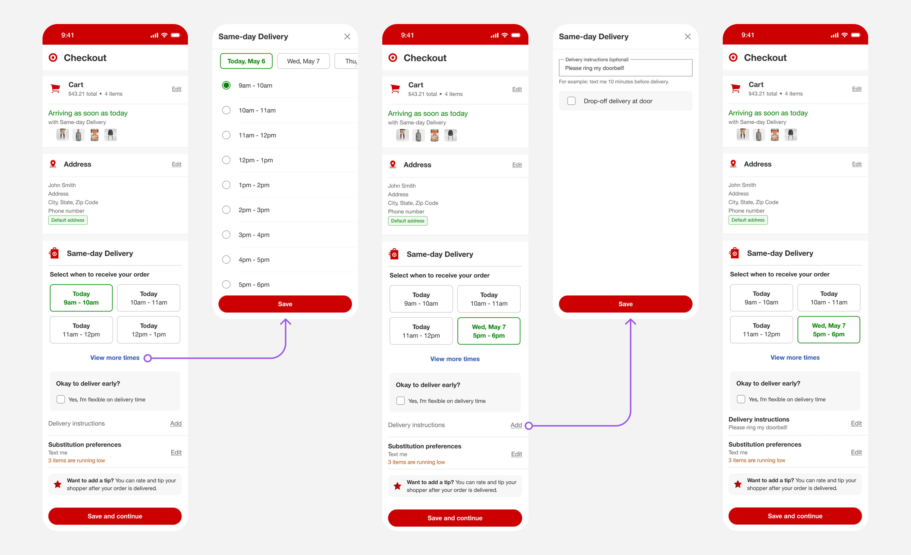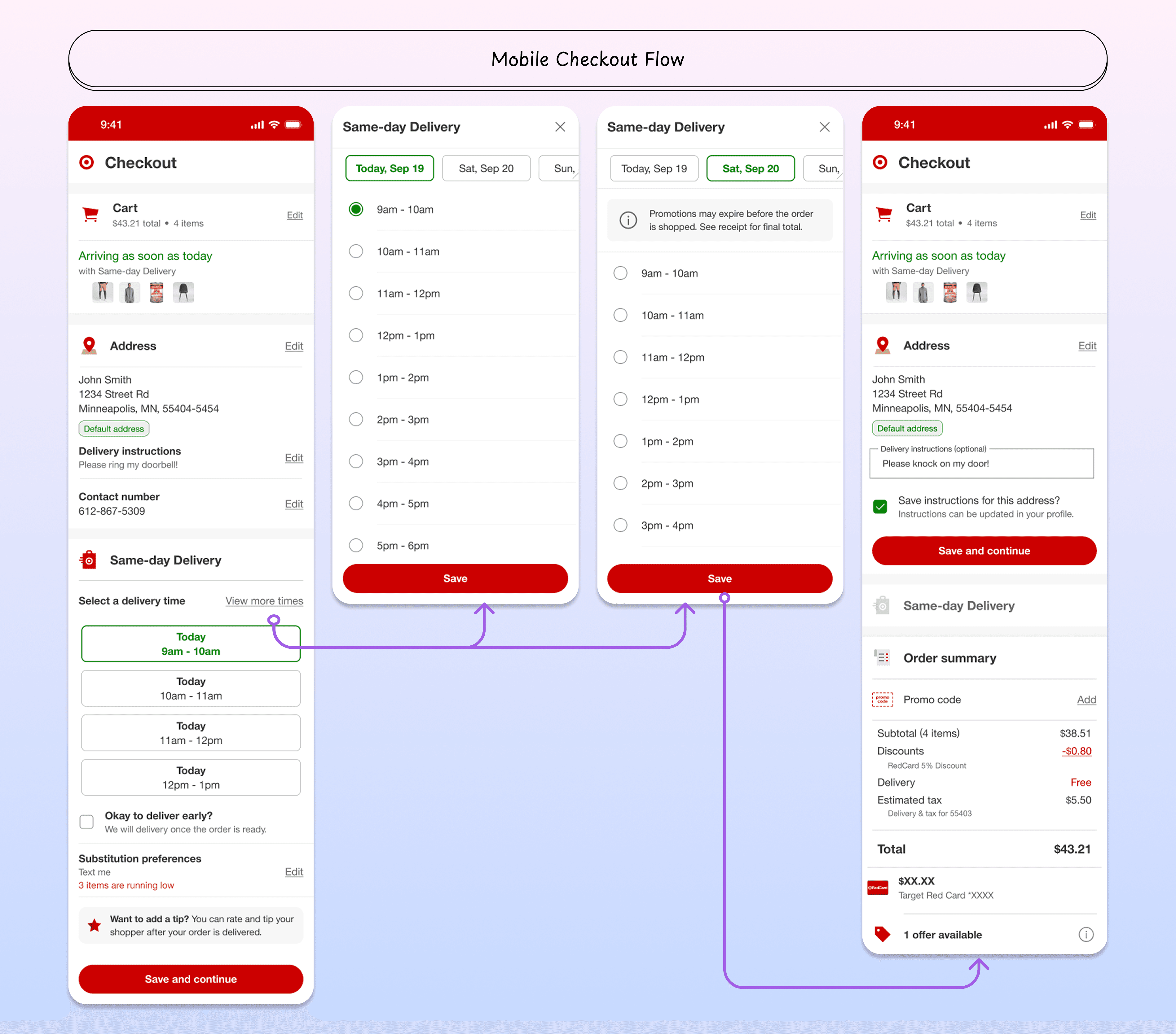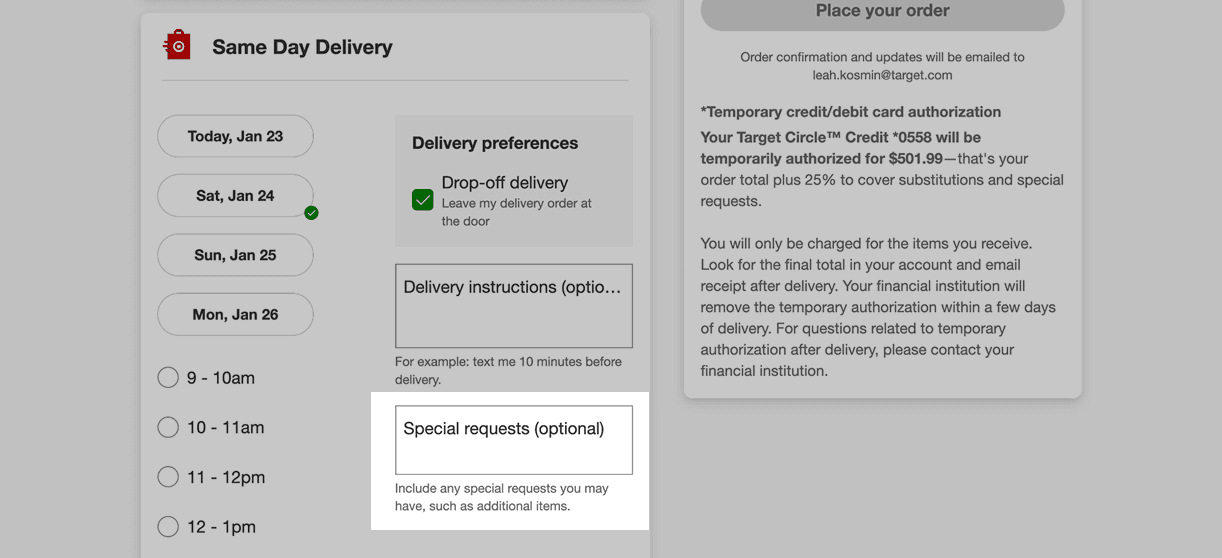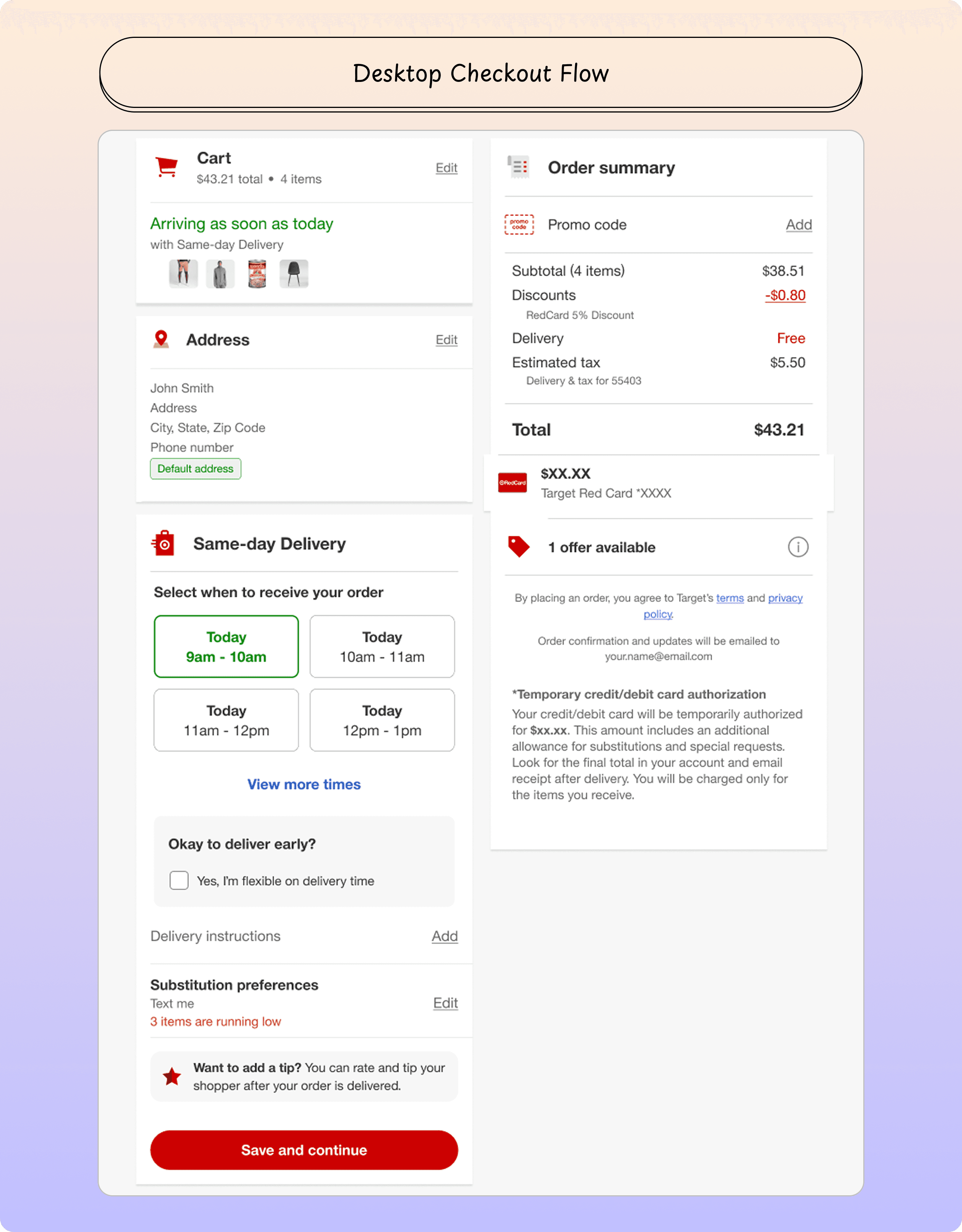 Today, shoppers have a multitude of shipping options to receive their order, including same-day delivery. Guests are required to select a delivery window time before completing the checkout process. The flow works, but the UI has not been evaluated or updated in many years.