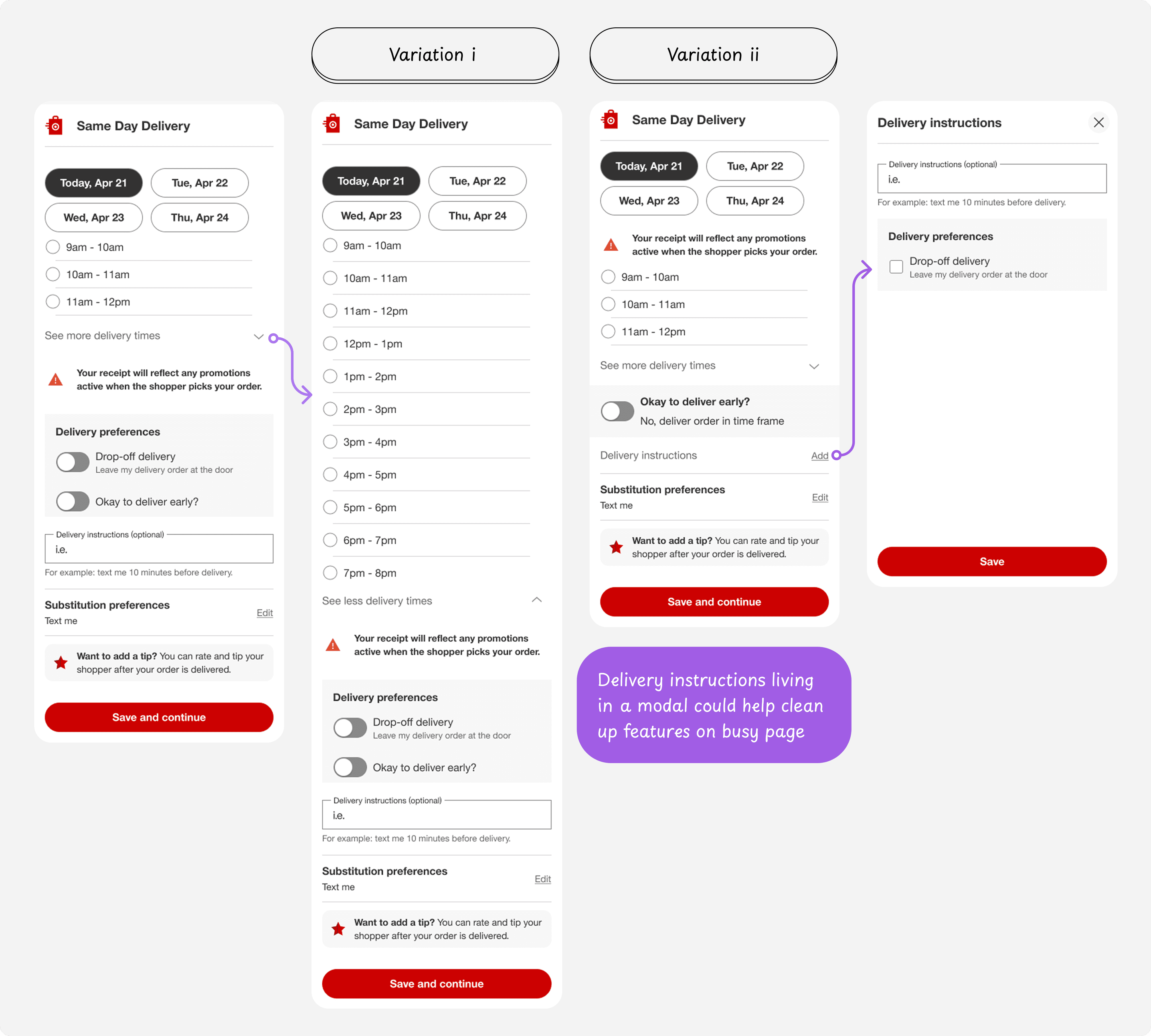 After sharing these designs internally, the design systems team had concerns around inconsistencies such as the “View more times” not being consistent with other actionable items on the page. The ”Okay to delivery early?” checkbox also was distracting in a gray box, so I wondered if there was an alternative design for this as well.