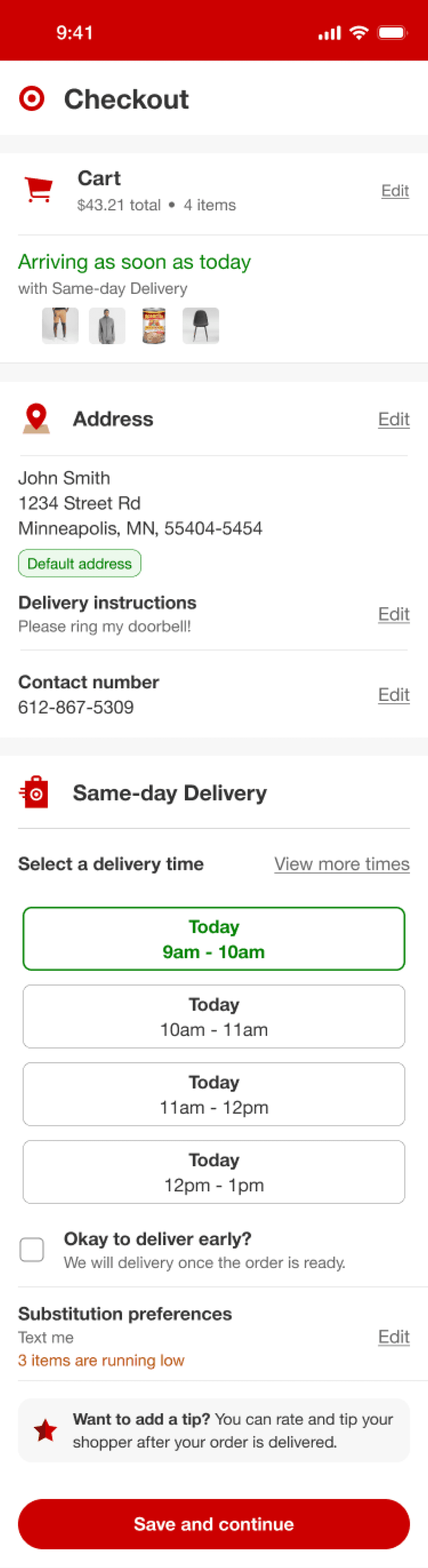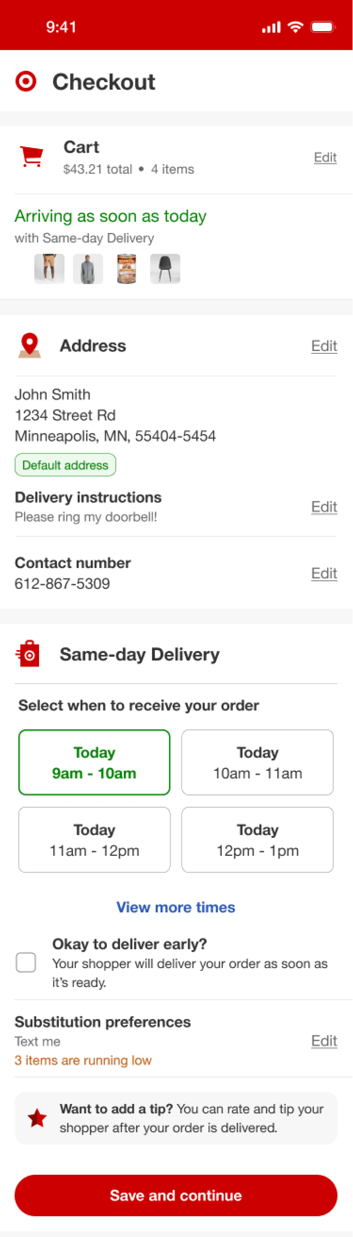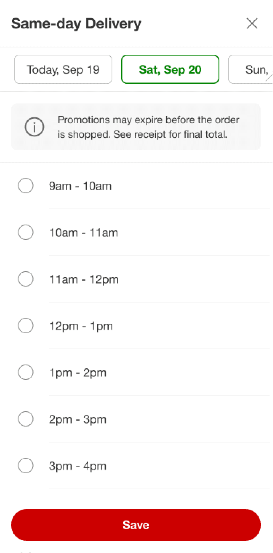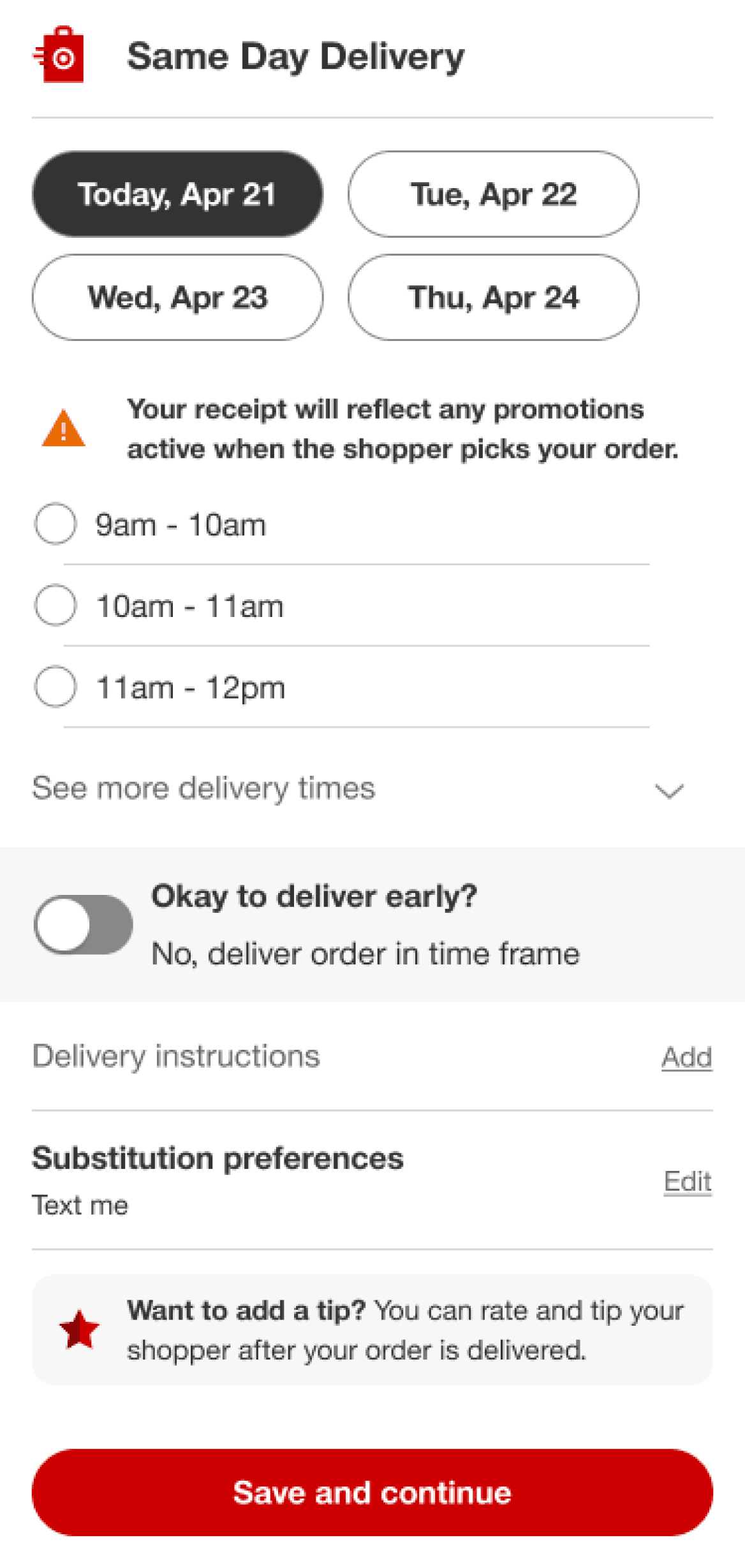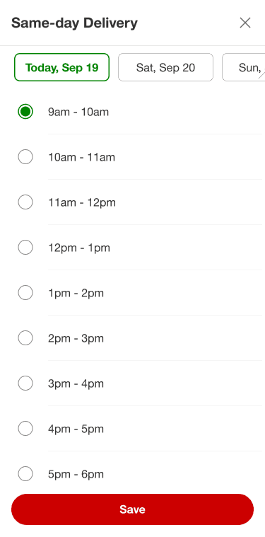 This solution assumes the user will select the first delivery time available, therefore selecting it automatically for them. As an alternative, the user could choose to Schedule Delivery to display more times.
