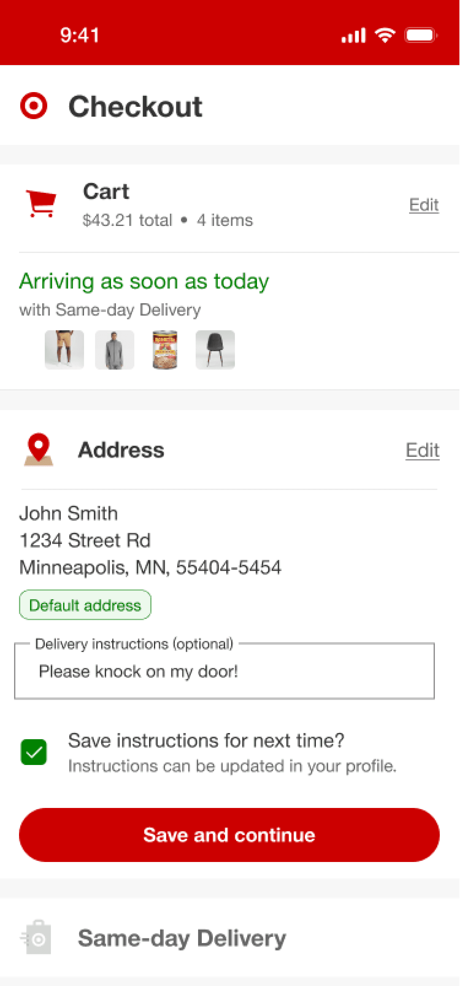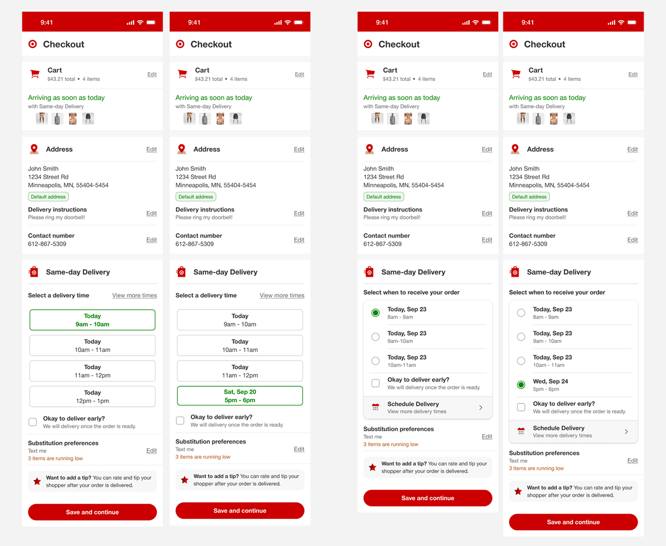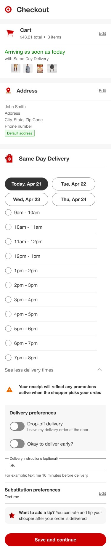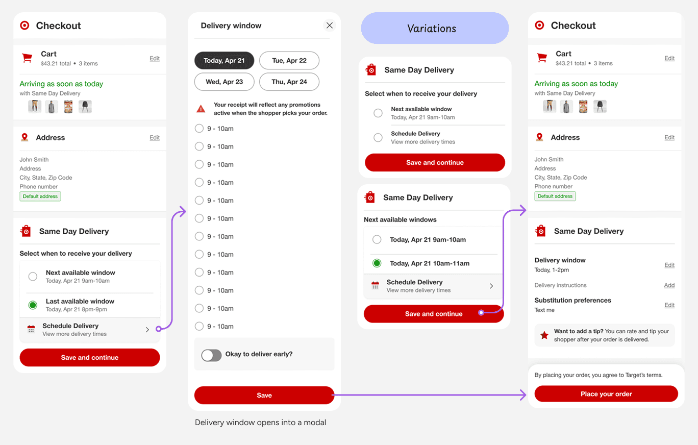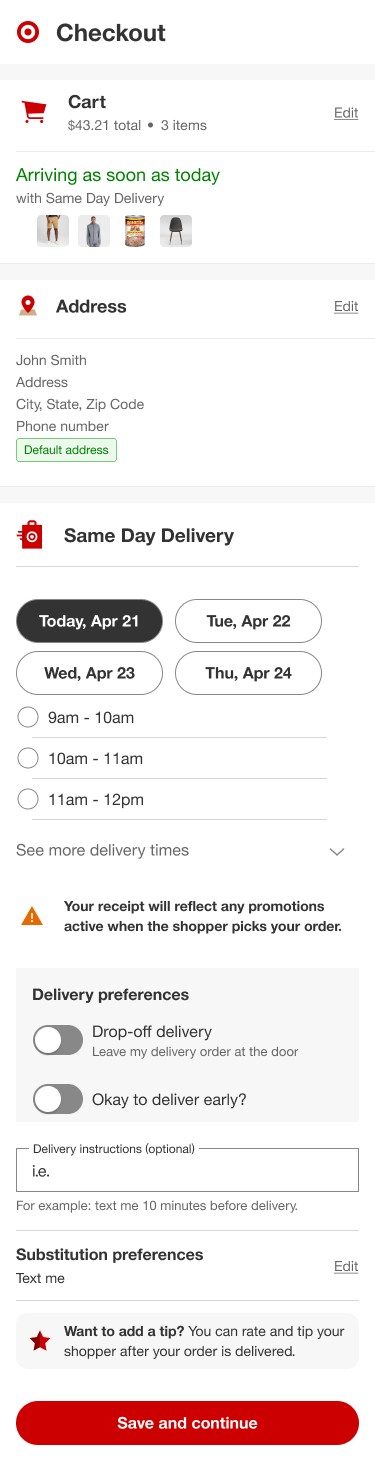 In order to try and further cleanup the SDD section, I wondered if moving delivery instructions to address would feel more natural and therefore help users move through the flow quicker and more successfully. This prototype was also tested since Target had made updates such that address was now being saved in user’s profile. This design could potentially be consistent with those updates as well.