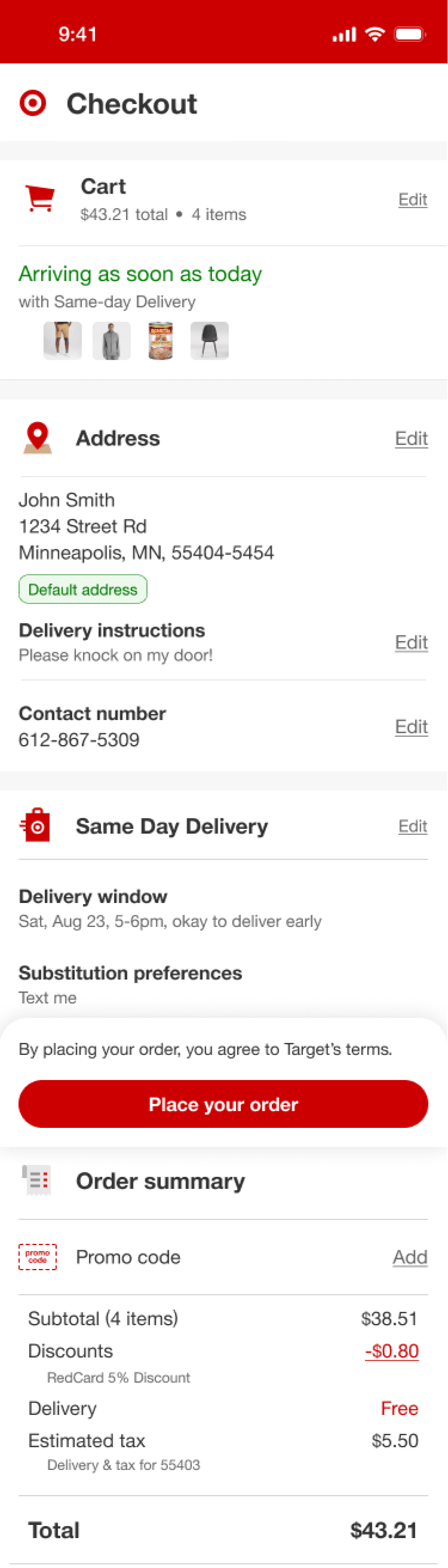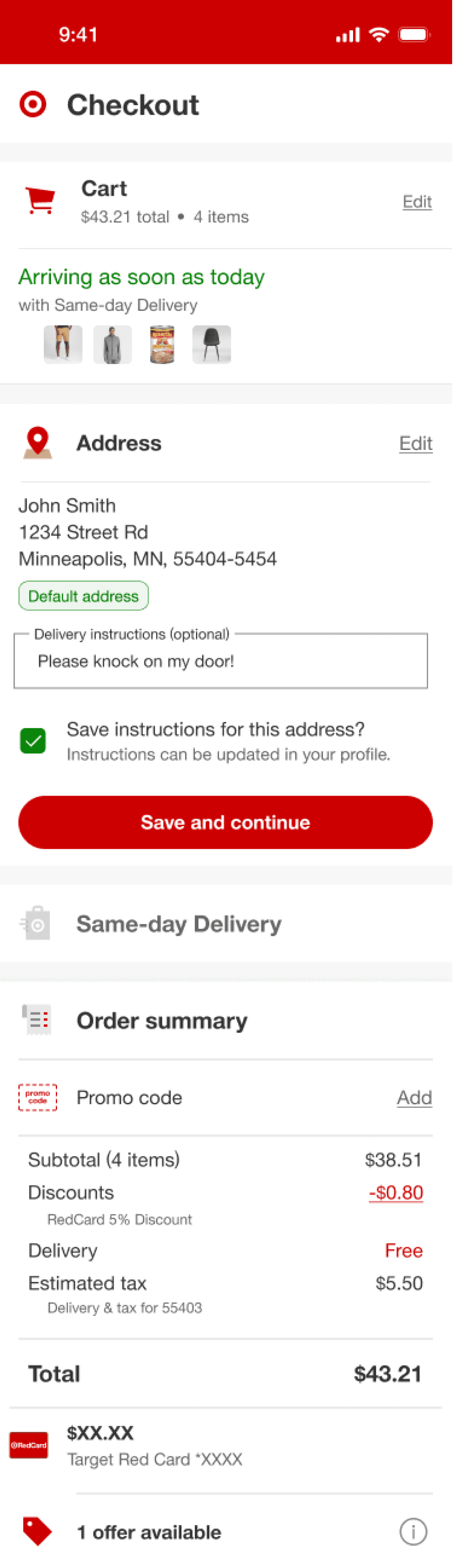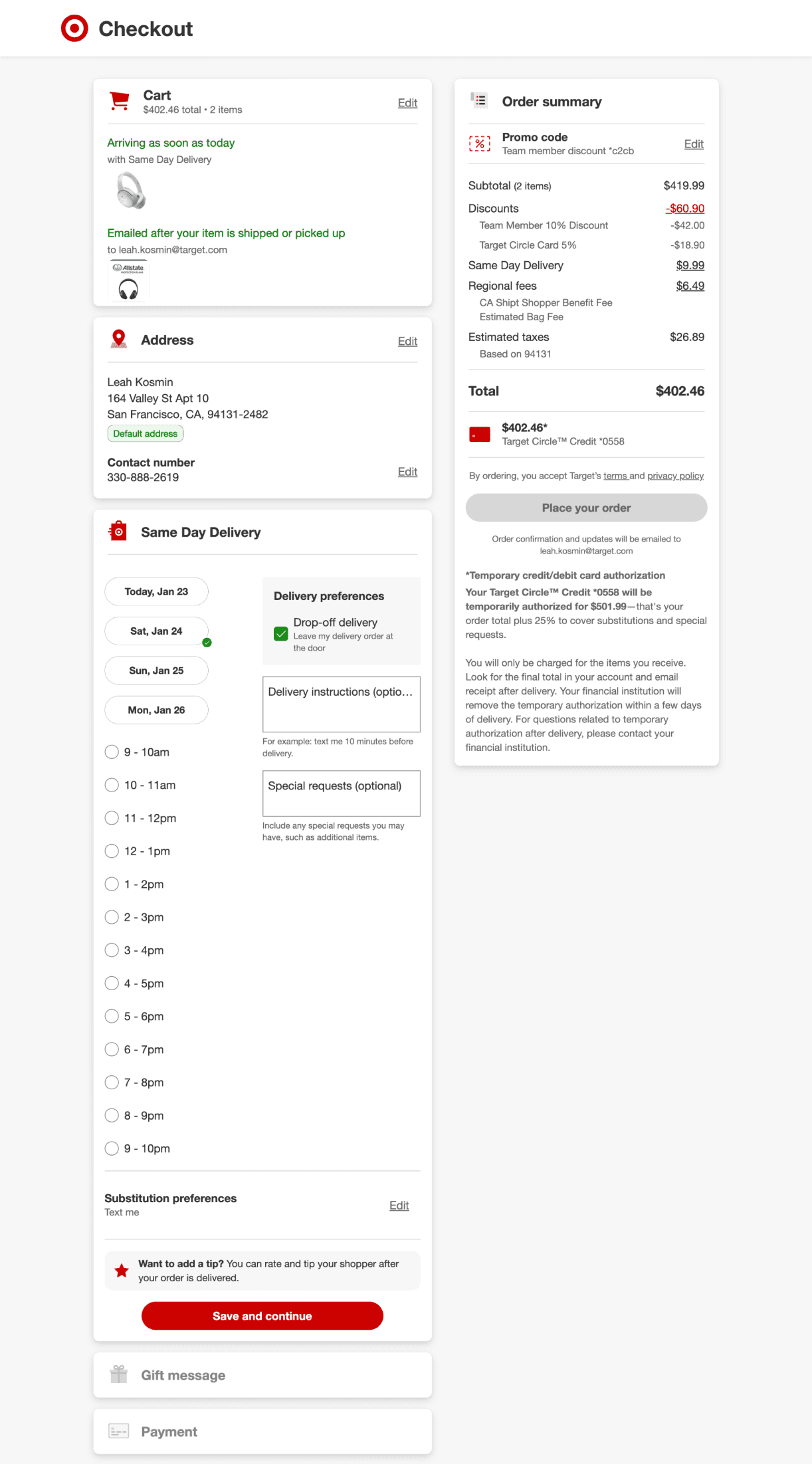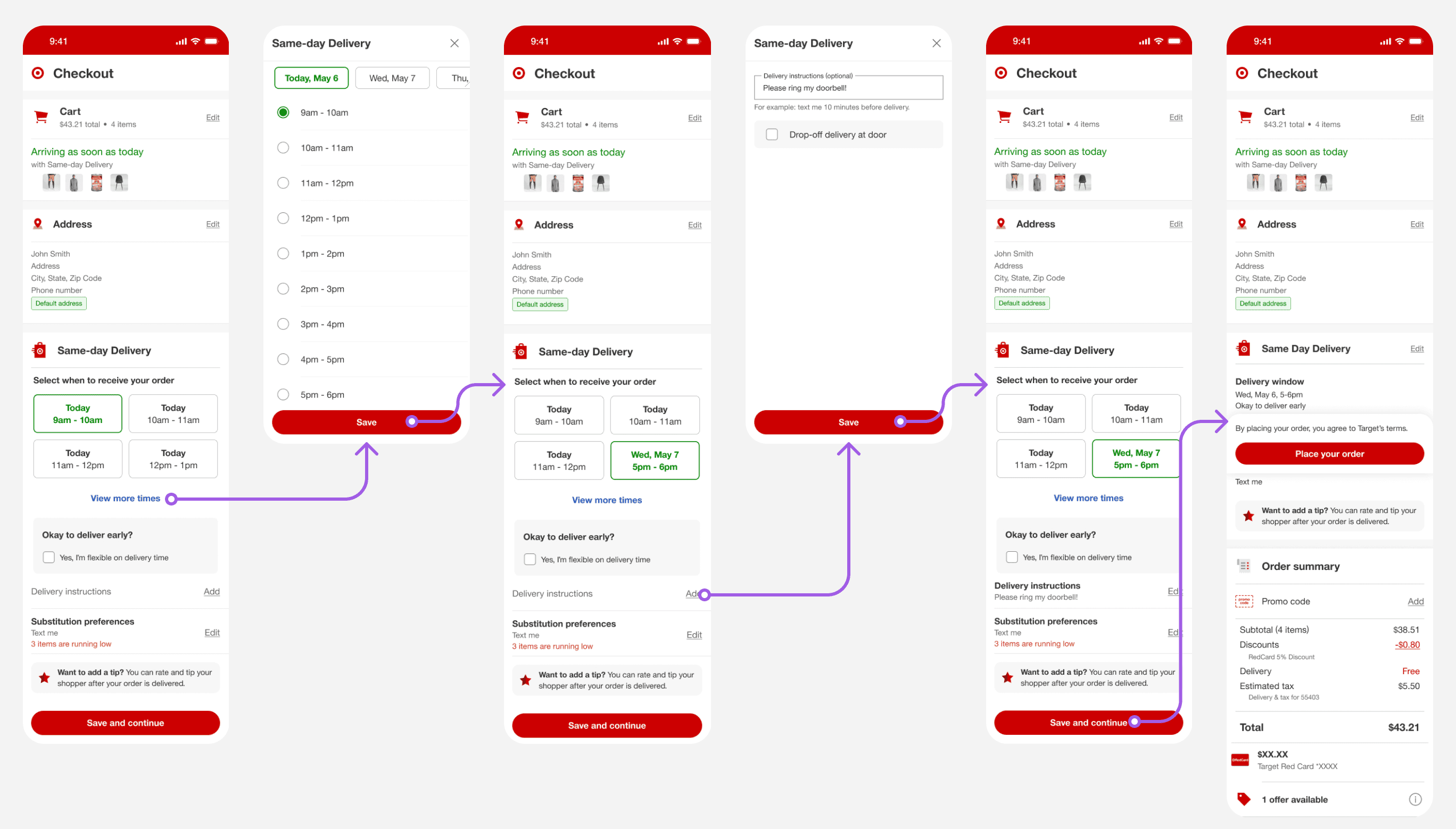 In order to try and further cleanup the SDD section, I wondered if moving delivery instructions to address would feel more natural and therefore help users move through the flow quicker and more successfully. This prototype was also tested since Target had made updates such that address was now being saved in user’s profile. This design could potentially be consistent with those updates as well.