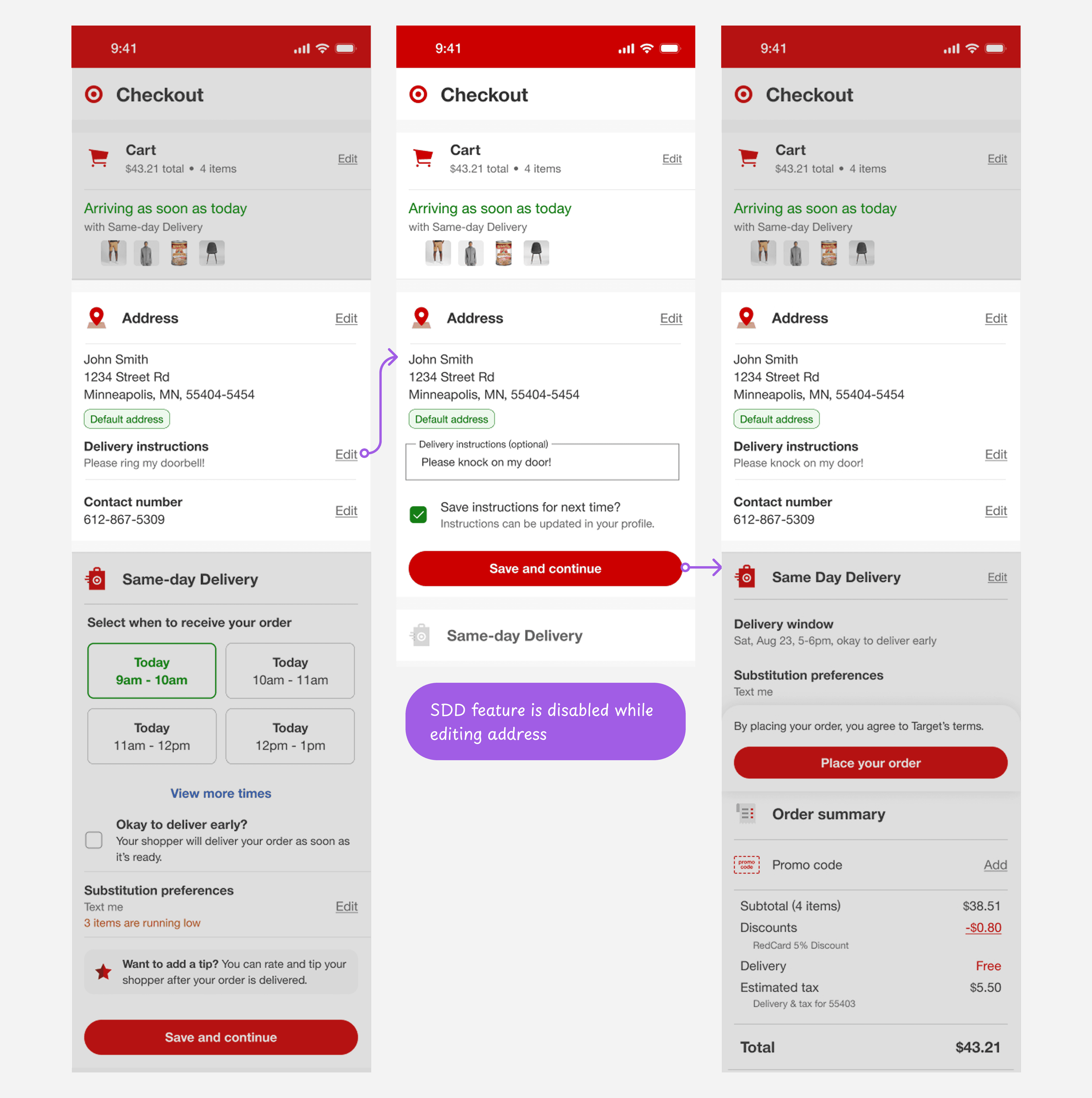 Across all rounds, several themes emerged. Users valued control over automation, particularly around saved delivery instructions. Trust was a recurring theme — even small ambiguities created anxiety in a high-stakes interaction like same-day delivery. Visual clarity and progressive disclosure reduced cognitive load and increased confidence.
