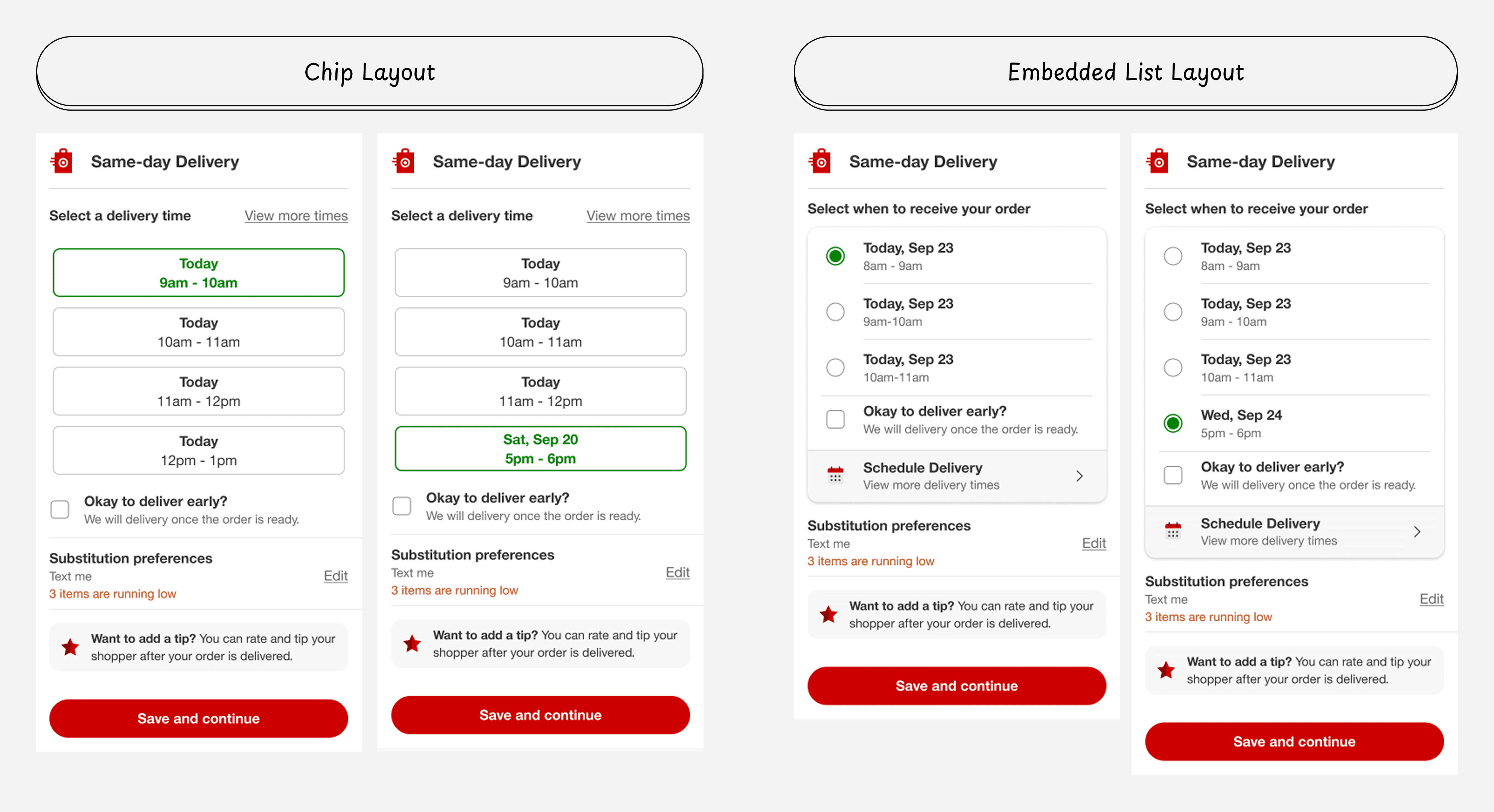 After many rounds of user testing and gathering data, I still felt the lingering question: chips vs list? After all, the list format was used in many areas of the website. Though, part of my hesitancy came the potential design issues regarding alignment with an embedded list format. In order to help clarify any doubts and optimize the delivery window experience, I ran an AB tests for the two interaction models to see if chips or embedded list would perform stronger.