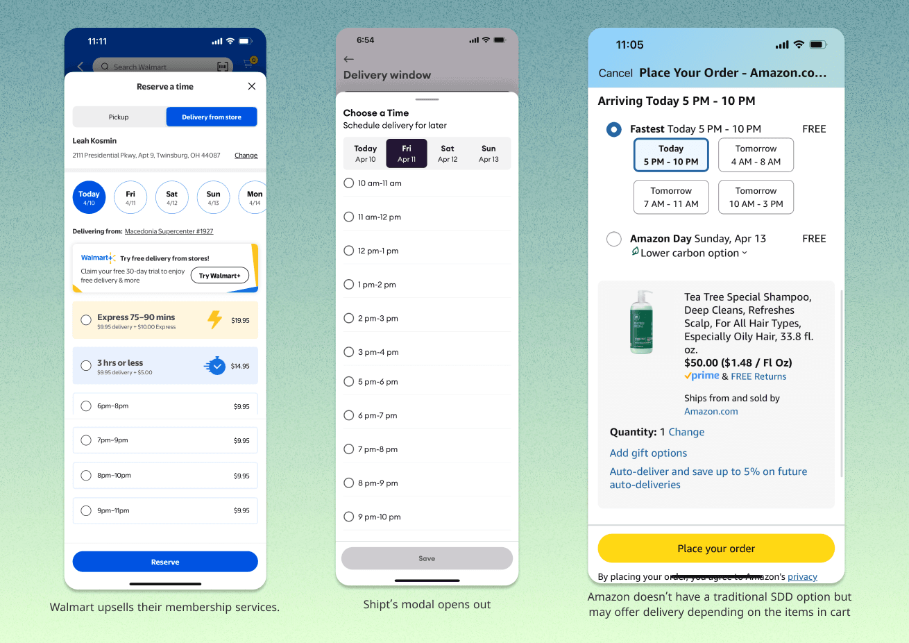Looking at our competitors, companies like Walmart were taking advantage of their space and up-selling express delivery options. Walmart also utilizes 2 hour windows to shorten their delivery lists. However, upon researching users preferred having the 1 hour windows, not liking the ambiguity of 2 hours for when a delivery could happen. Amazon combines their SDD option window with regular shipping, offering SDD potentially depending on when the order is placed or if a minimum dollar amount is reached.