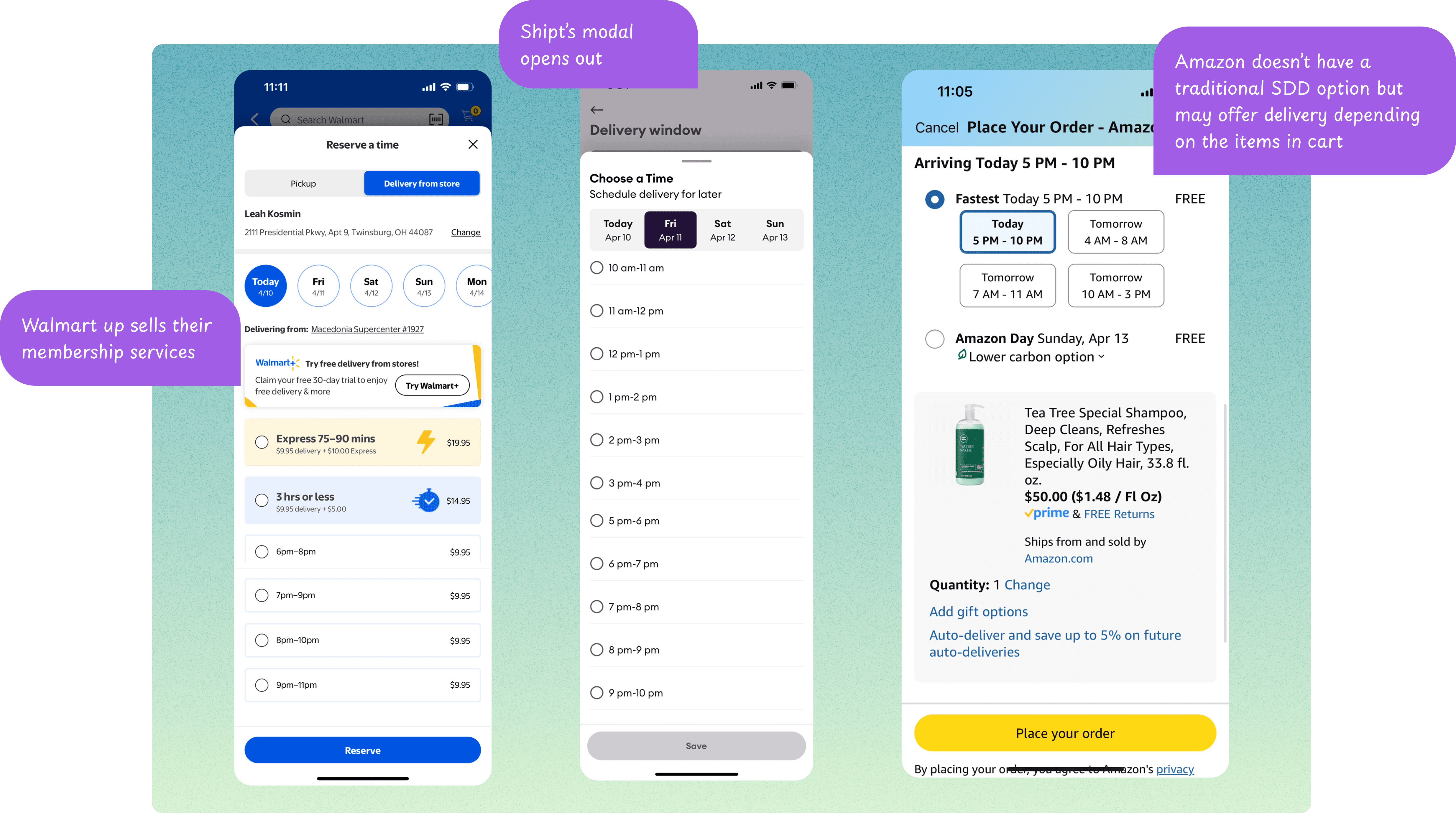 Looking at competitors, companies like Walmart were taking advantage of their space and up-selling express delivery options. Amazon combines their same-day delivery option window with regular shipping, offering SDD potentially depending on when the order is placed or if a minimum dollar amount is reached.